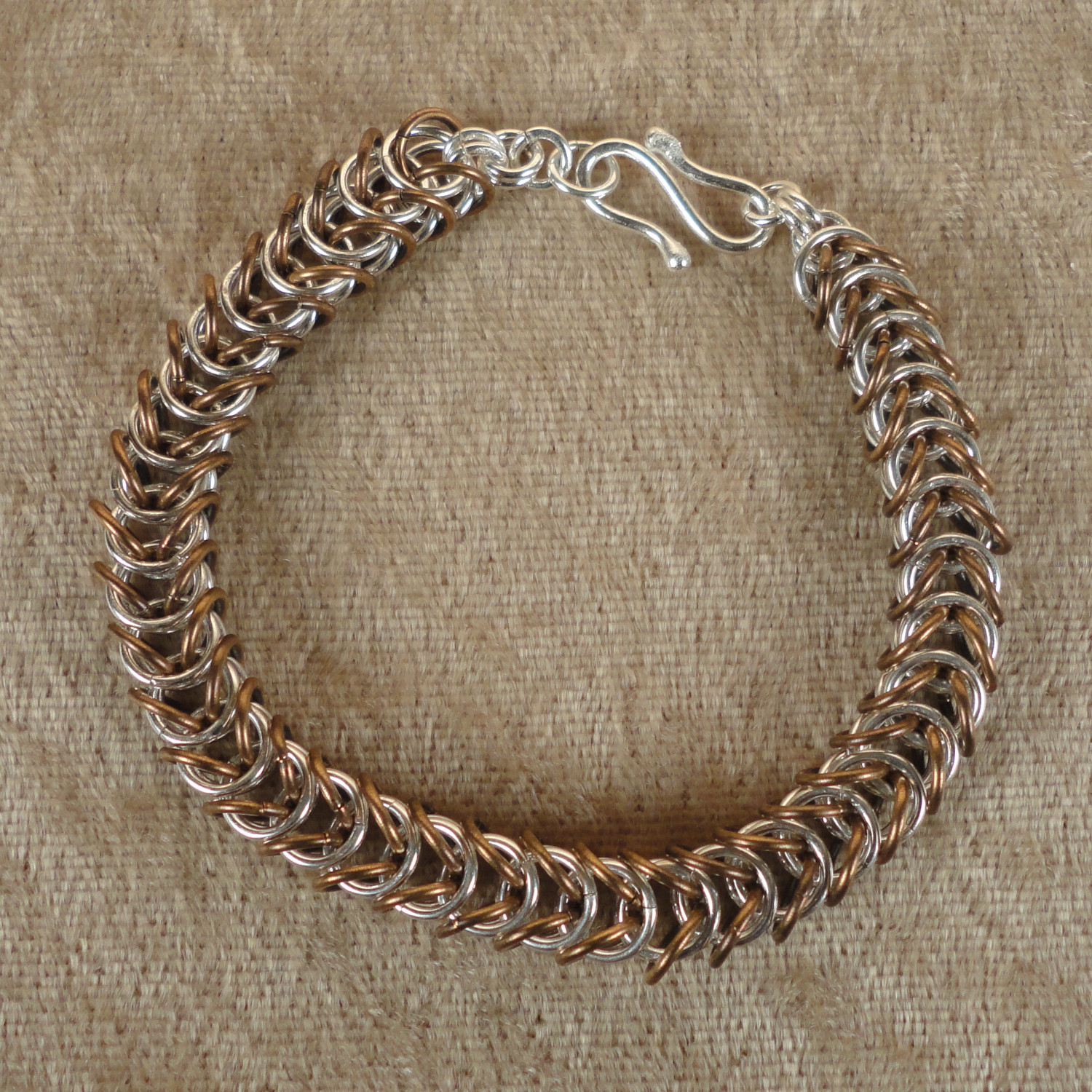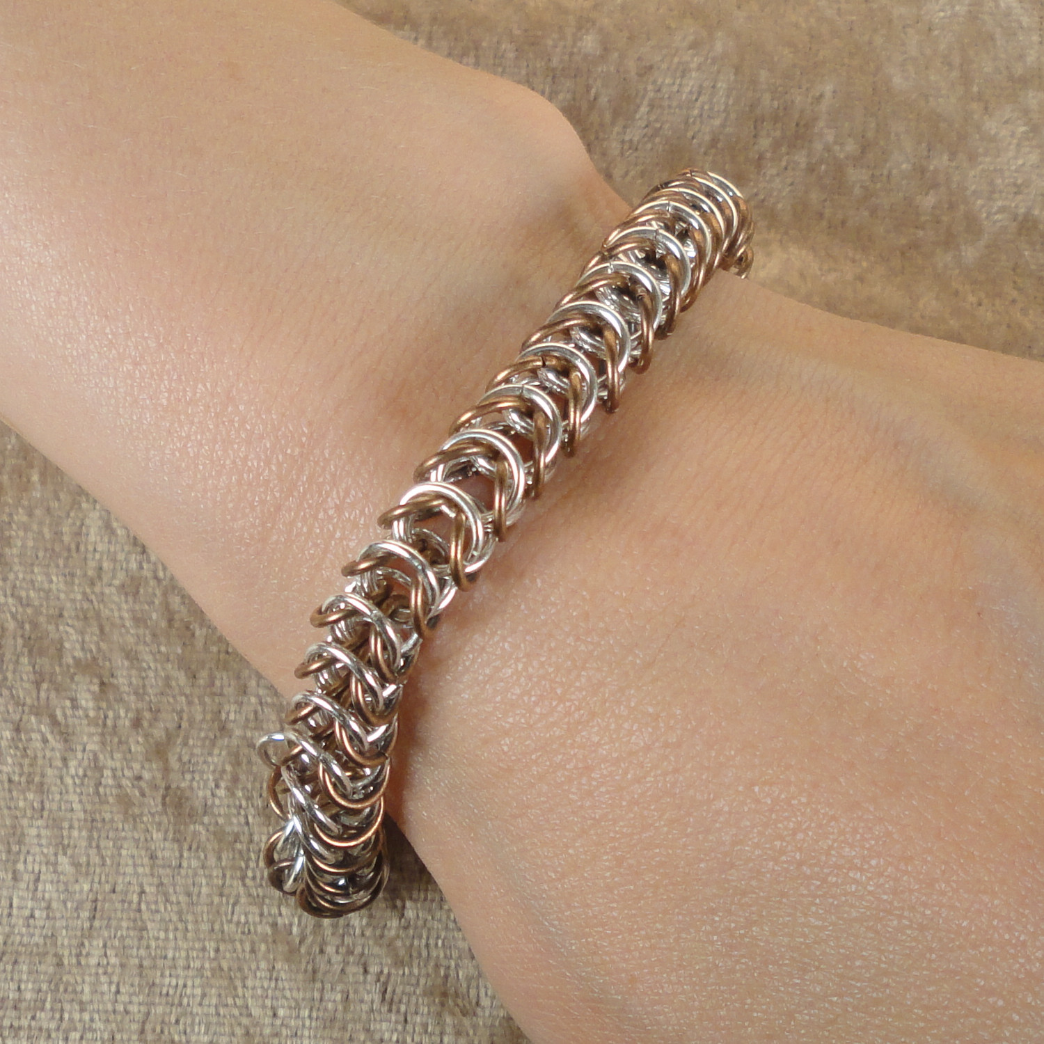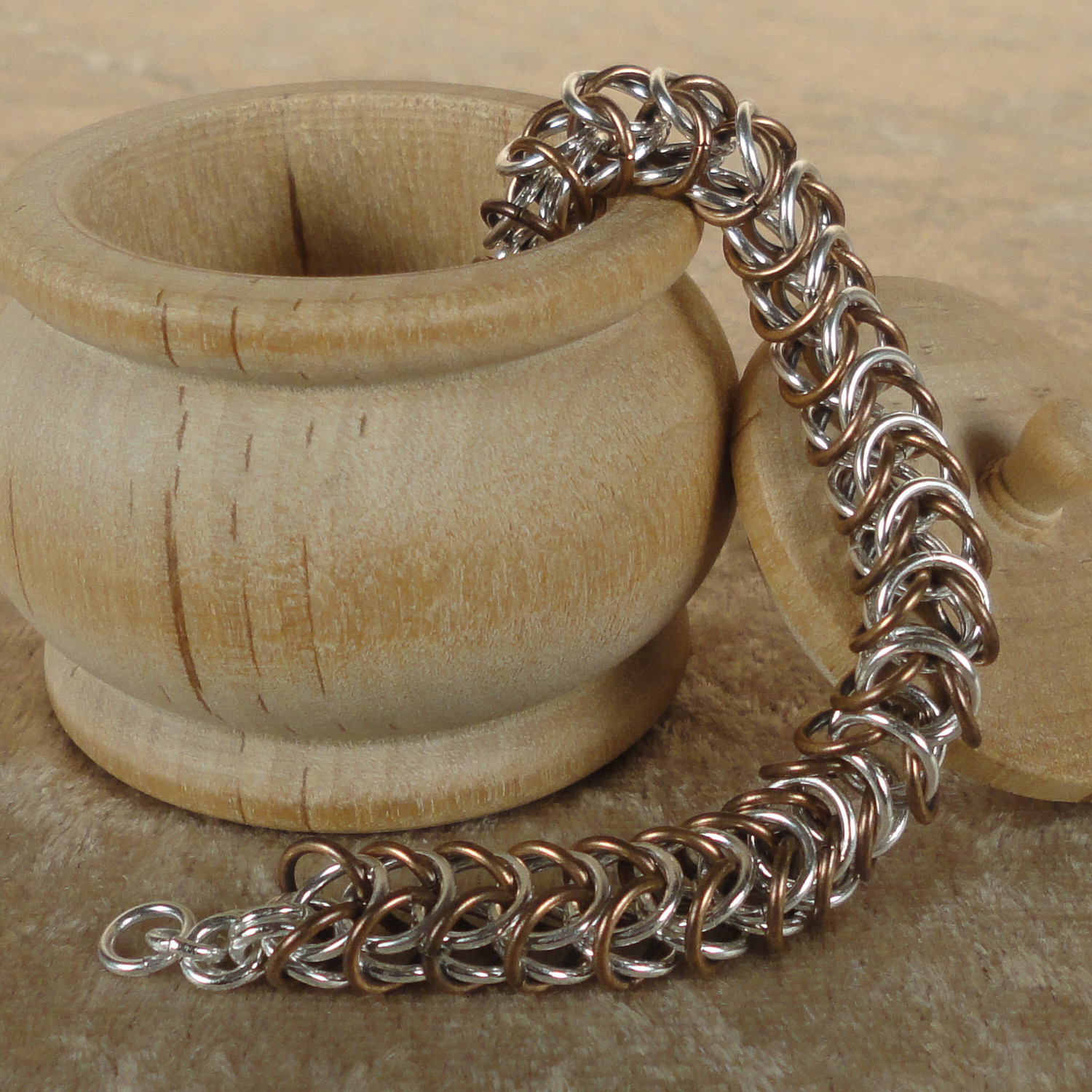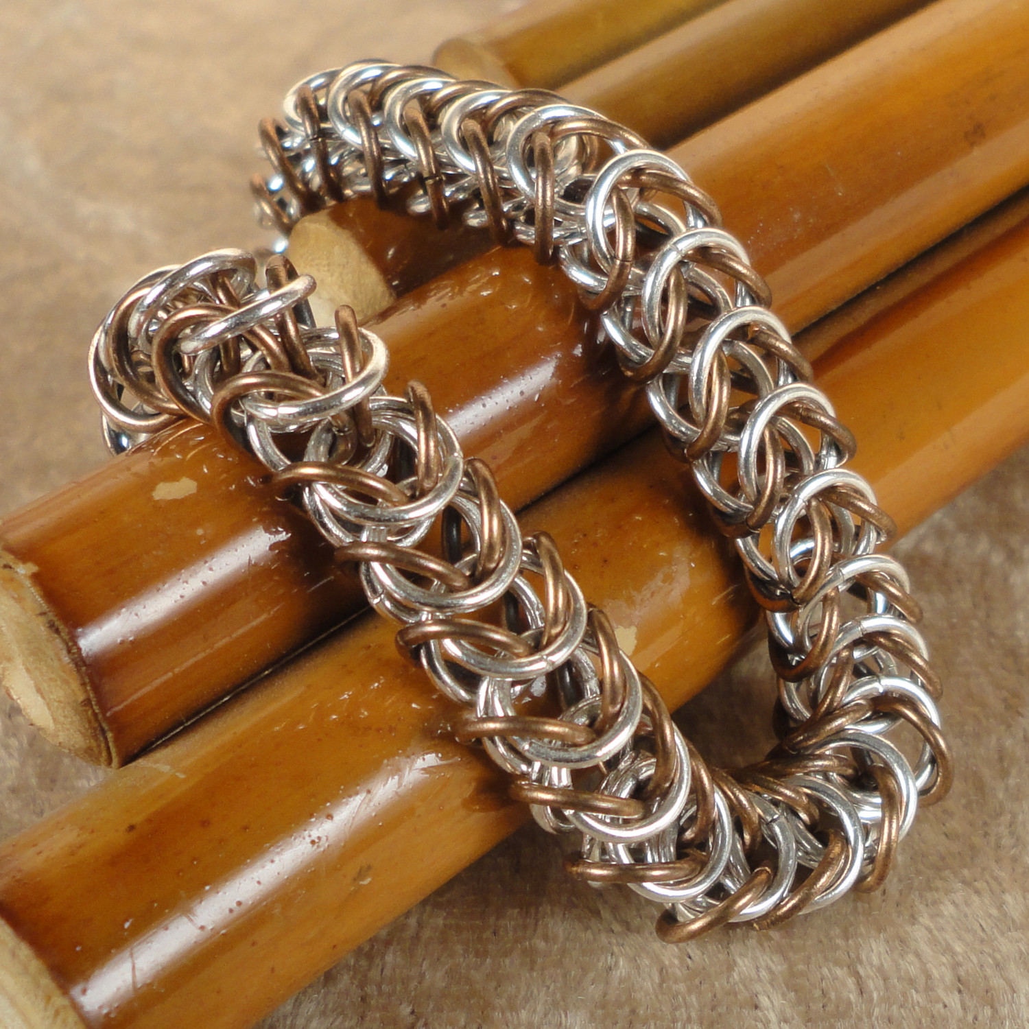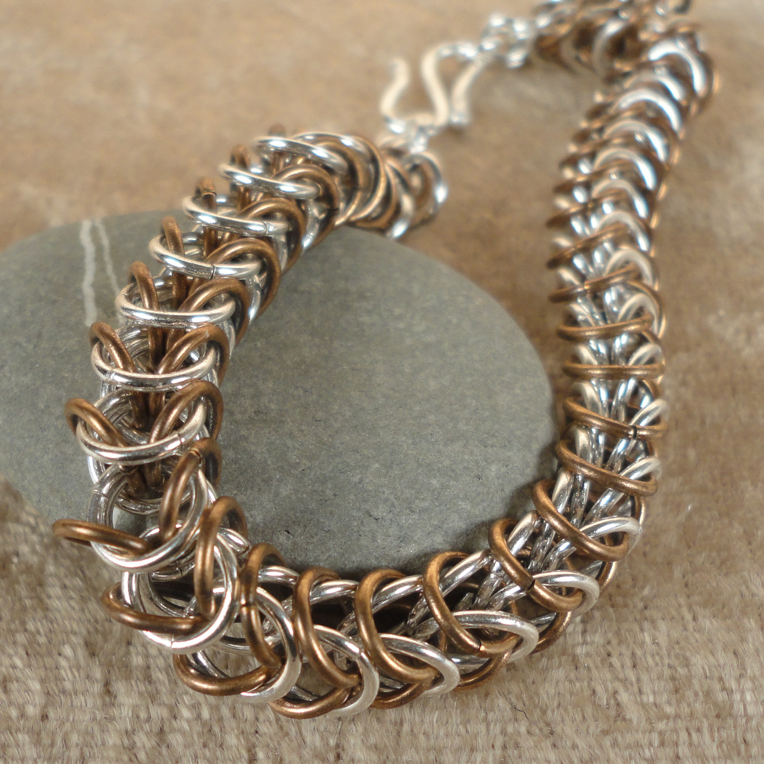 This Box Weave Bracelet is an intricate chain maille bracelet, using contrasting silver plated and antique bronze plated jump rings individually hand woven in an undulating box weave chain maille pattern.
